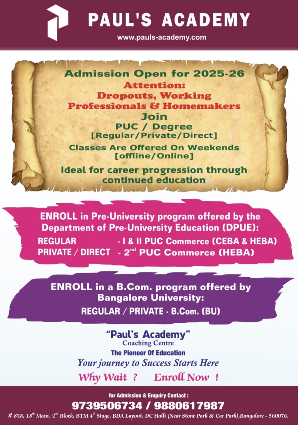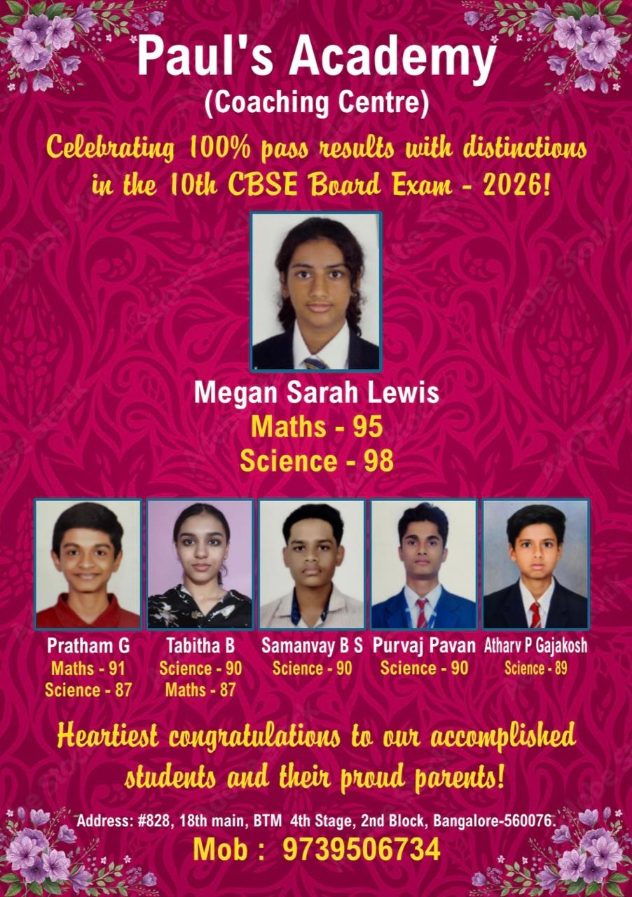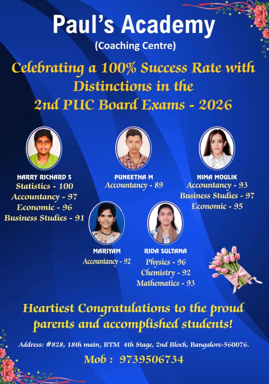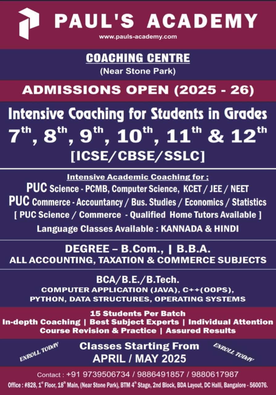 A phrontistery for students to meet the right teachers outside their institutional environment. We aim at providing a positive and stress-free ambiance for students to ascertain from qualified and compassionate teachers. Faculty here are highly qualified, trained and dedicated to curate their teaching methodology to the needs of each pupil, specialised in offering school and college tuitions for various academic subjects and curriculum. We also provide CET Entrance coaching, JEE/NEET, 1st year, 2nd year PUC coaching and other competitive exam coaching. Added every student will benefit with all the essential learning materials needed for application and practice. Coaching is highly methodical, planned and time bound. Contact us to benefit our cost-effective coaching services and be a part of Paul’s Academy.